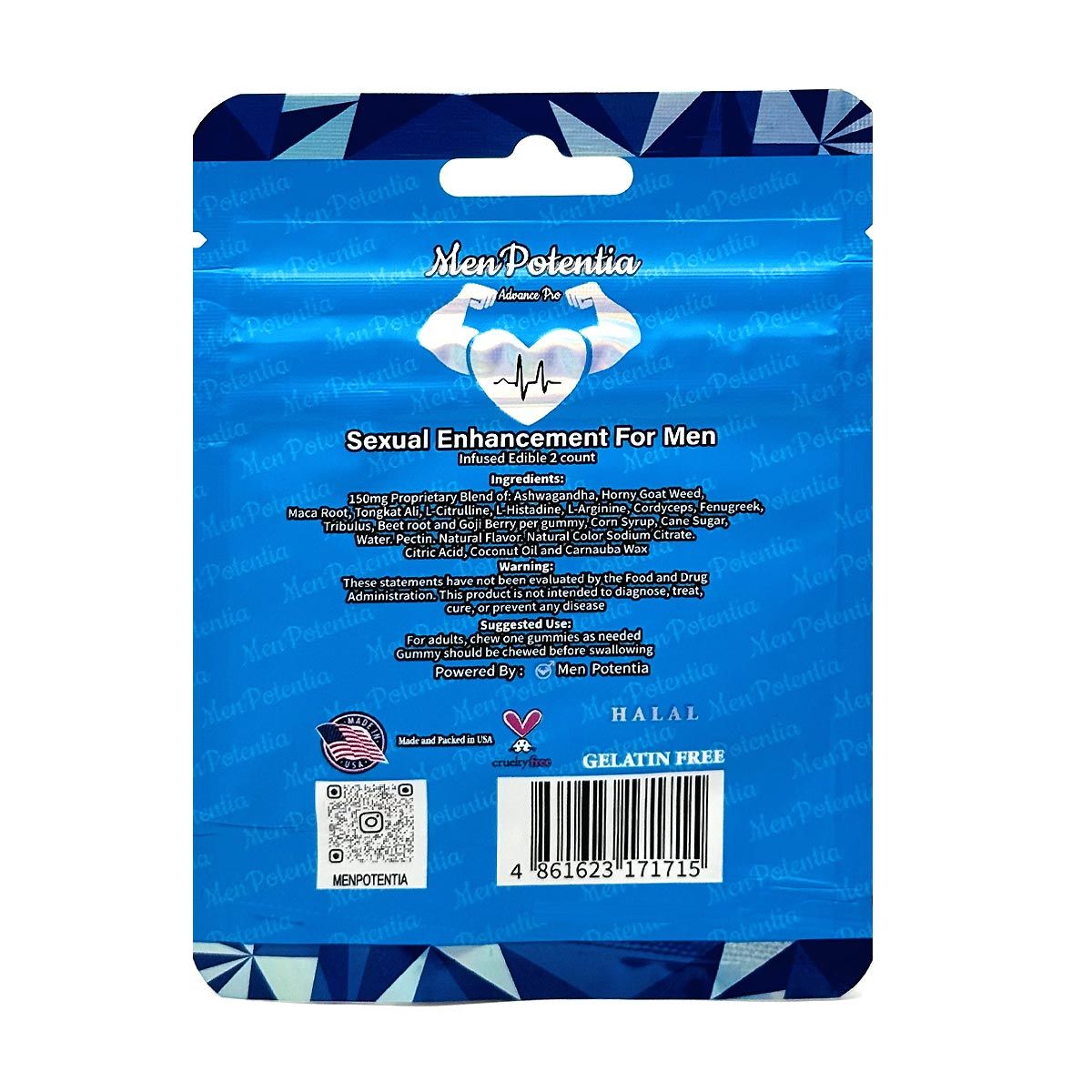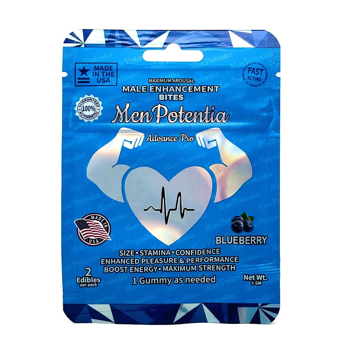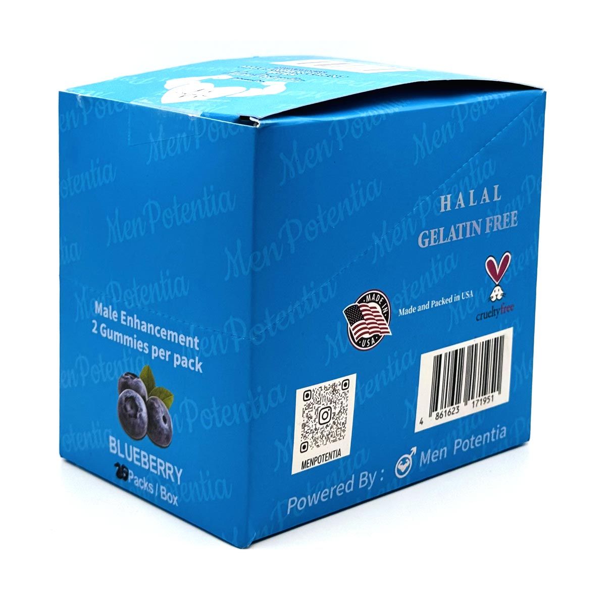 Boost performance and pleasure with Men Potentia Blueberry Gummies. 150mg of potent herbs per gummy. Halal, gelatin-free, and cruelty-free. Blueberry flavored male enhancement. Supports stamina, energy, and confidence. Made in the USA – 2 gummies per pack.