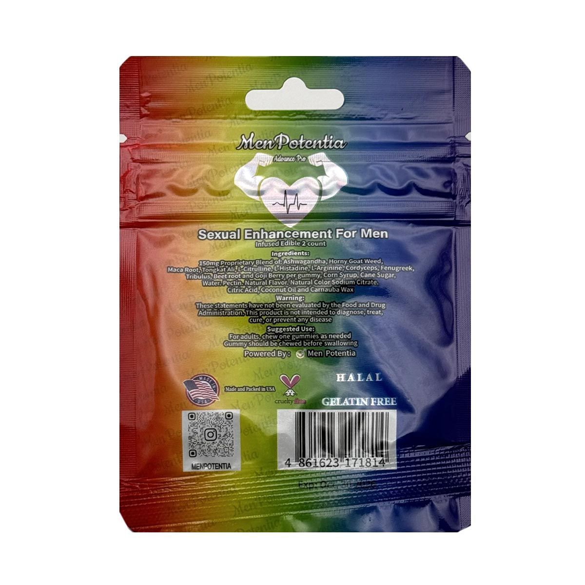 Do not exceed one Men Potentia Gummy in a 24-hour period. Consult a physician before use if you have any medical conditions or if you experience any adverse reactions. Store in a cool, dry place. Keep out of reach of children.