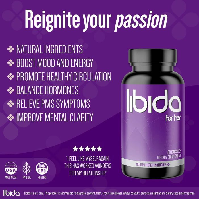 Additionally, Libida provides relief from common PMS and menopause symptoms such as cramps, mood swings, fatigue, and bloating by restoring hormone balance. Manufactured in the USA and third-party tested for quality, Modern Health Naturals Libida for Her is ideal for adult women seeking natural support for sexual wellness and overall health.