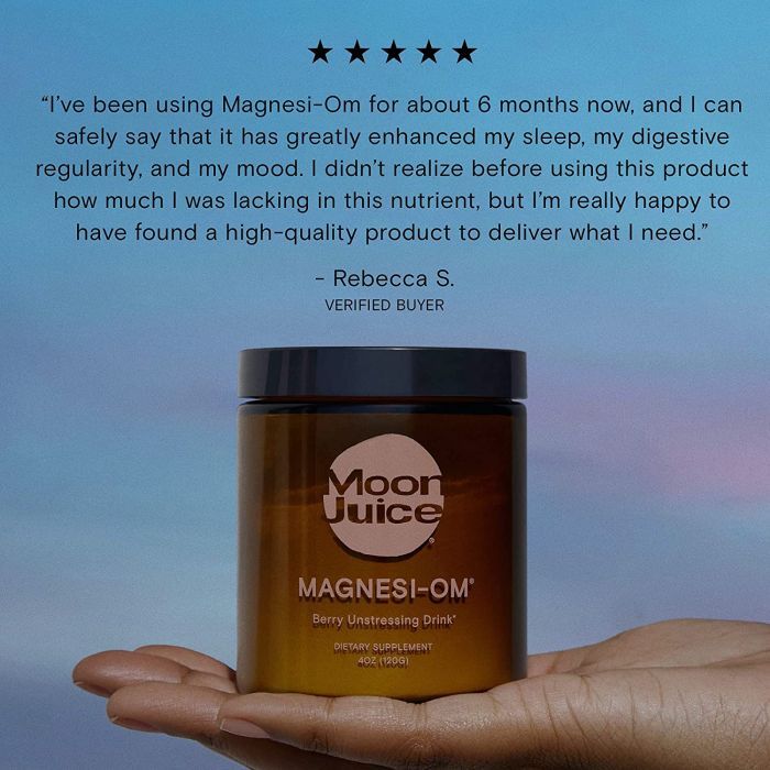 A: Moon Juice Magnesi Om Magnesium Powder blends three ultra-bioavailable magnesium forms with L-theanine, giving you that mellow vibe without the drowsy fog.