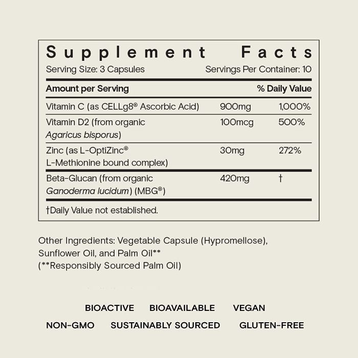 A: A vegan immune-boosting supplement with vitamins C, D2, zinc, and Beta-Glucan for enhanced defense.