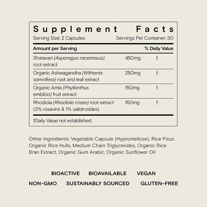 - Contains adaptogenic herbs like Shatavari, Ashwagandha, Amla, and Rhodiola for stress relief