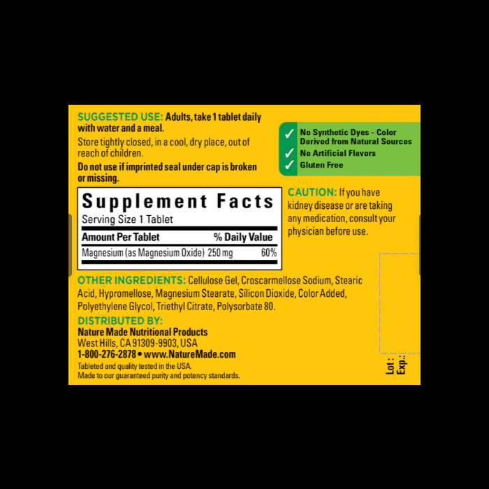 Together, these components ensure that each Nature Made Magnesium Oxide 250 mg Tablet delivers reliable absorption and stability without unnecessary additives.