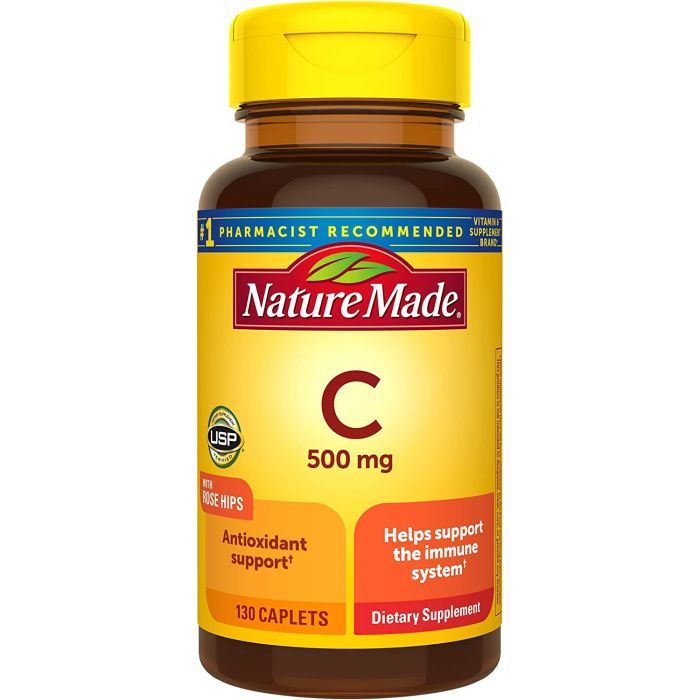 Nature Made Vitamin C 500mg with Rose Hips supports immune defense, antioxidant health, and collagen production. Gluten-free, no preservatives. 130 caplets.