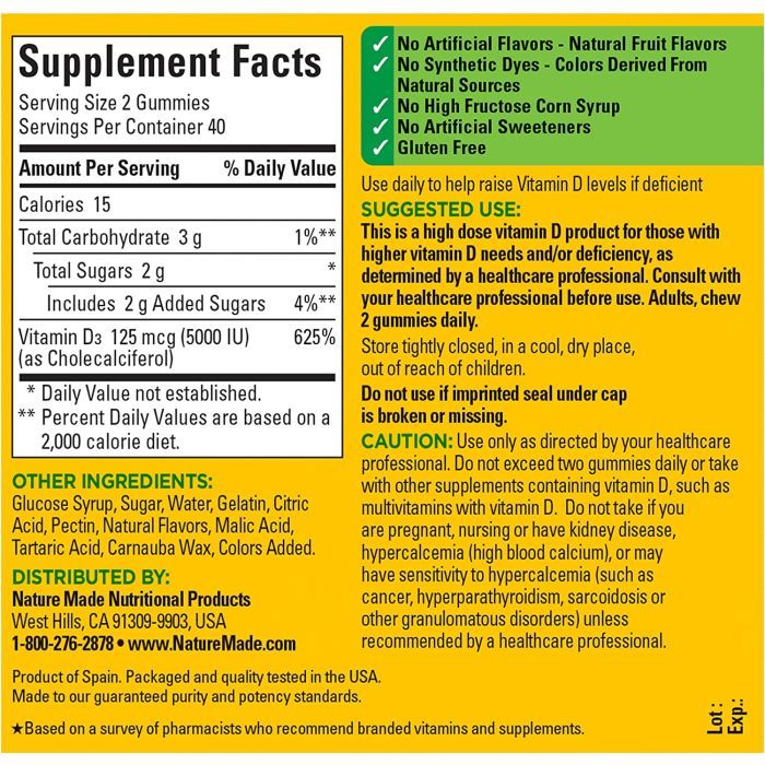 Nature Made Vitamin D3 Extra Strength 5000 IU Gummies are specially formulated to help maintain strong bones, teeth, muscles, and support immune health. Each 2-gummy serving provides 125 mcg (5000 IU) of Vitamin D3, the body’s preferred form of Vitamin D. This high-strength supplement is designed for adults with higher Vitamin D needs or deficiency, as determined by a healthcare professional.
