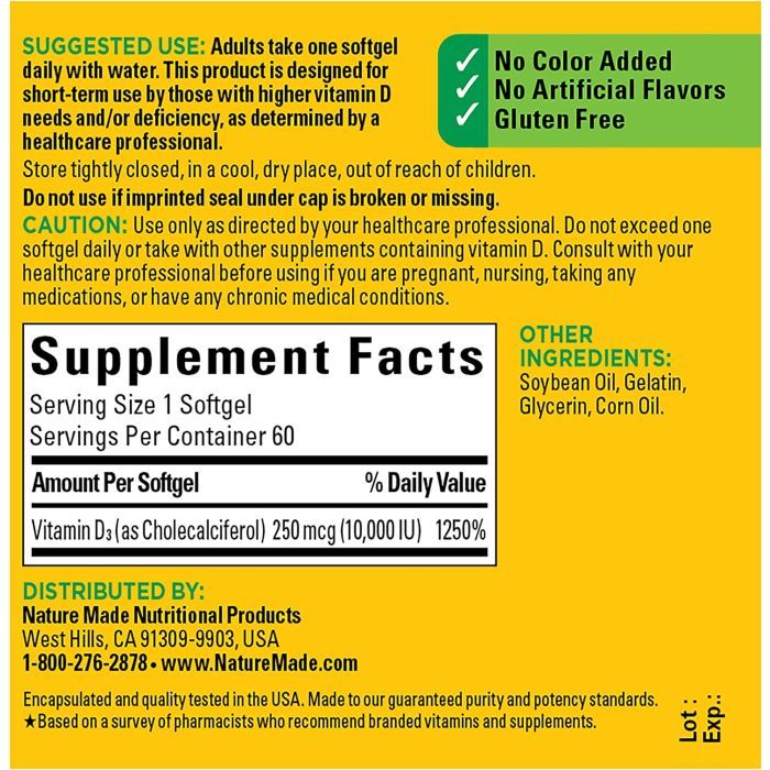 | Nature Made | Vitamin D3 Maximum Strength 10,000 IU | 1 Softgel | Softgel | 60 Softgels |