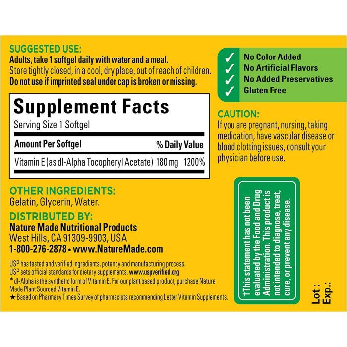 | Product Name | Nature Made Vitamin E 400 IU (180 mg) dl-Alpha Softgels |