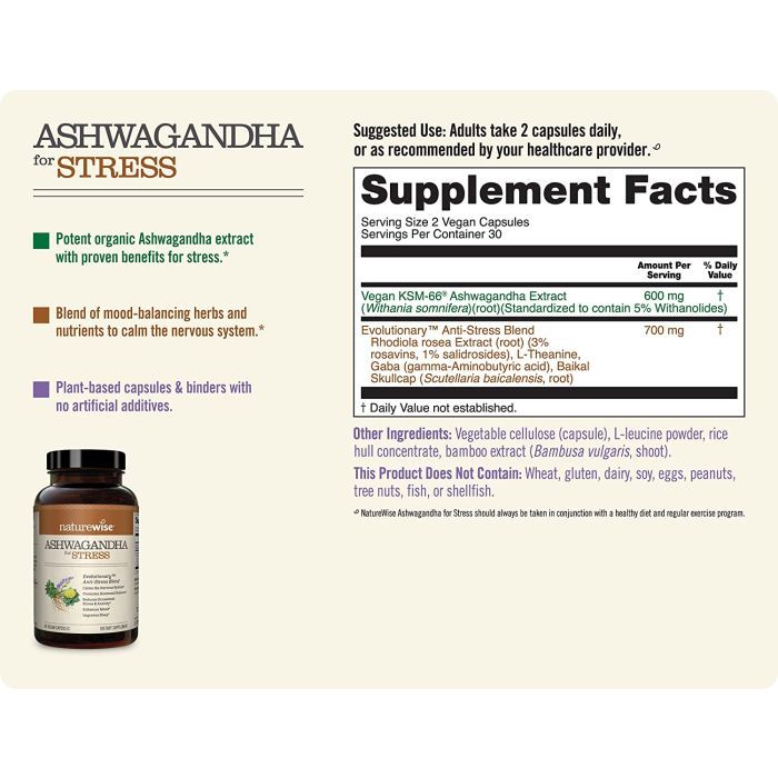NatureWise Ashwagandha for Stress helps calm the nervous system and reduce anxiety. With KSM-66® Ashwagandha, Rhodiola, GABA, and more, it promotes hormonal balance, improves sleep, and supports overall emotional wellness in a vegan, allergen-free formula.