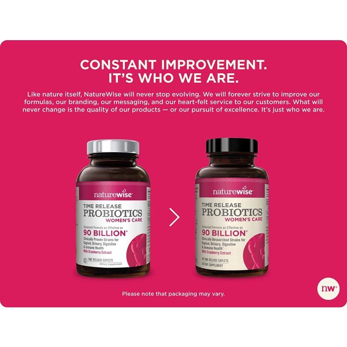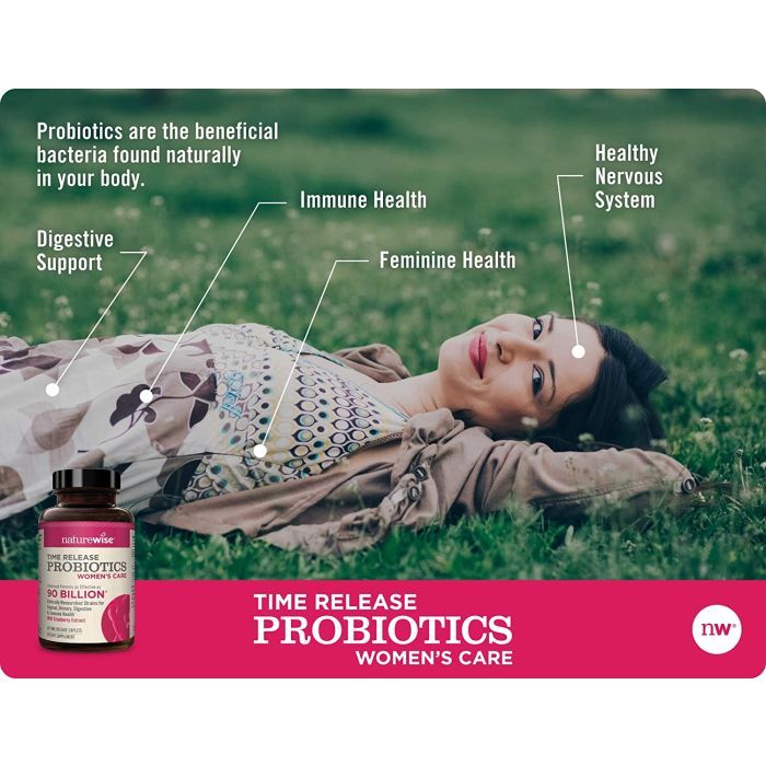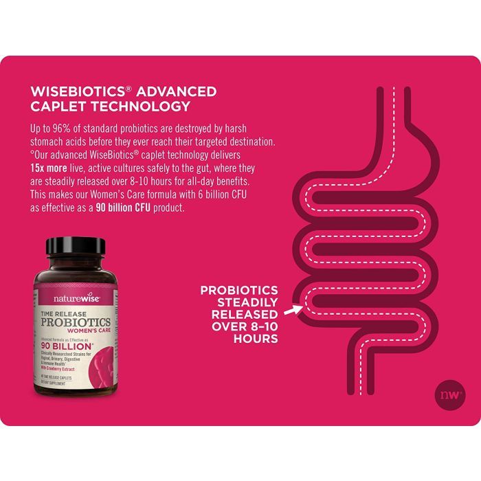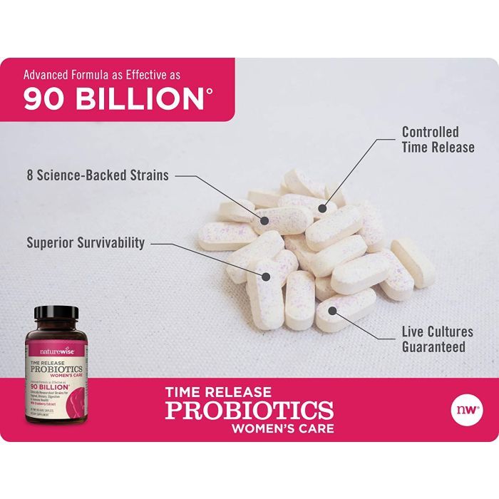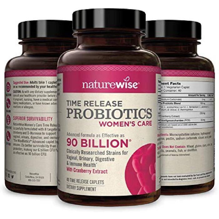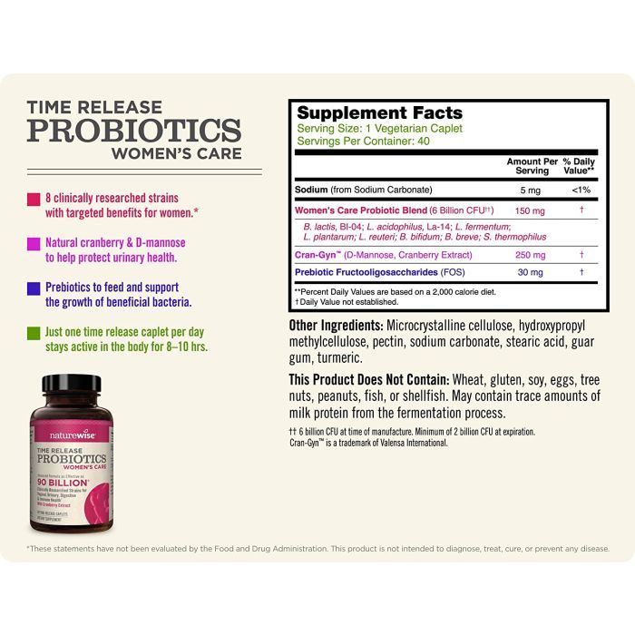NatureWise Time Release Probiotics Women’s Care 90 Billion supports digestive, vaginal, urinary, and immune health with 8 probiotic strains, cranberry extract, and prebiotic fiber. Vegetarian, gluten-free, and GMP-certified. 40 caplets per bottle.
