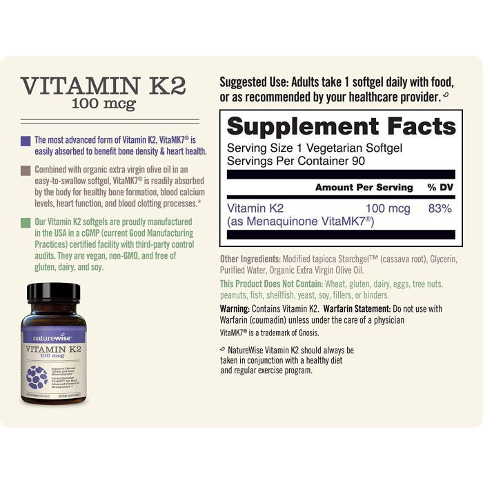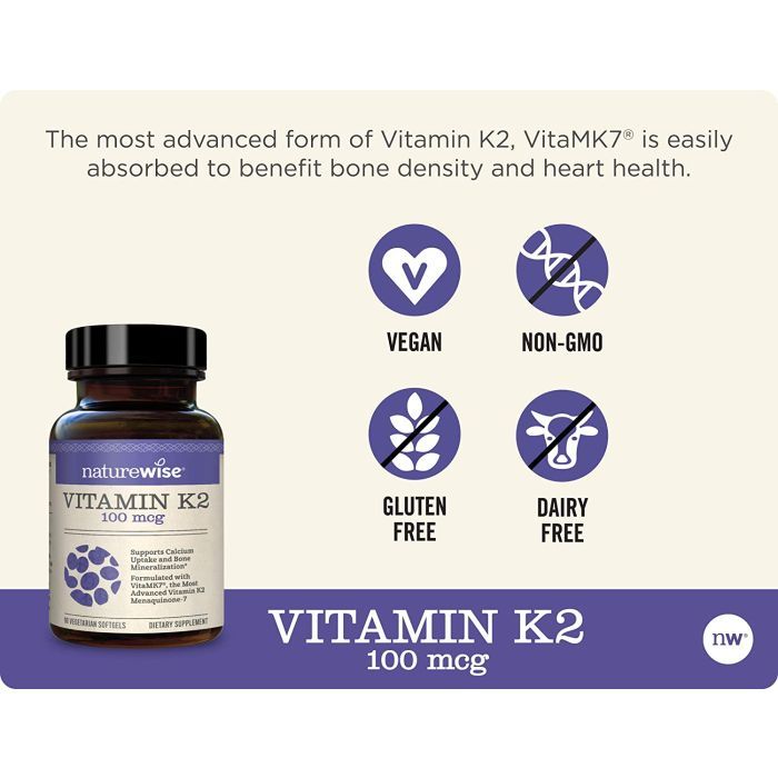NatureWise Vitamin K2 with VitaMK7® 100 mcg supports bone and heart health with superior absorption. Each softgel helps guide calcium into bones and teeth while protecting arteries. Vegan, non-GMO, gluten-free, and soy-free formula made with organic extra virgin olive oil. Manufactured in a USA cGMP-certified facility with third-party testing. Designed for adults seeking optimal calcium balance, strong bones, and cardiovascular support. 90 vegetarian softgels per bottle.