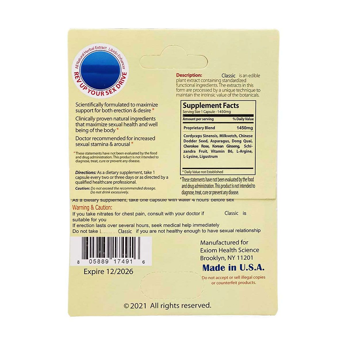 - Safe, Natural, and Scientifically Formulated: The creation of New CLASSICâ„¢ Male Sexual Enhancer focuses on safety, natural composition, and effectiveness.