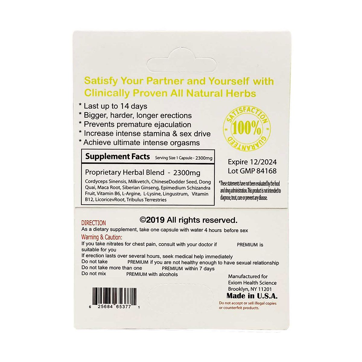 This product, New Premium Ultra Endurance Men Long-Lasting Sexual Enhancer, these statements, and claims have not been evaluated by the Food and Drug Administration. This product is not intended to diagnose, treat, cure, or prevent any disease.