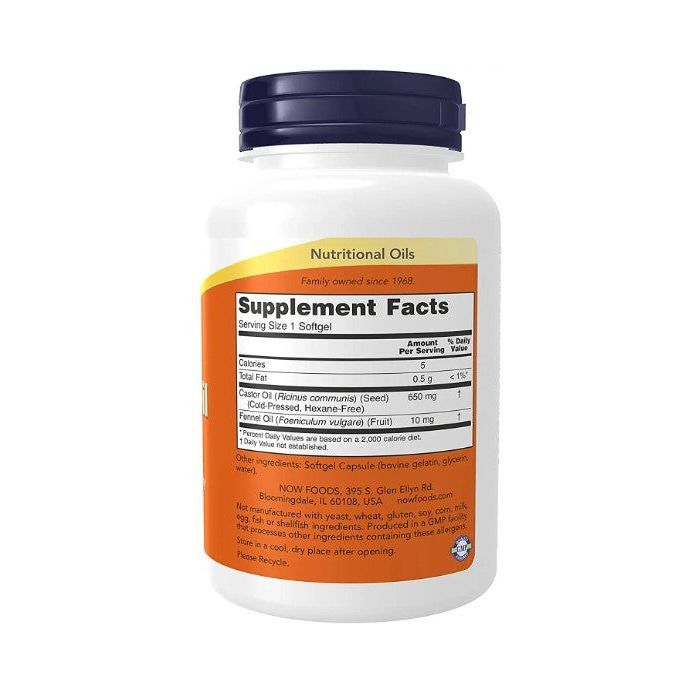 NOW Castor Oil 650mg offers gentle, natural laxative support in easy-to-swallow softgels. Cold-pressed, hexane-free, and blended with fennel oil for digestive comfort. Gluten-free and made in a GMP-certified facility. Perfect for occasional constipation relief and overall digestive health.