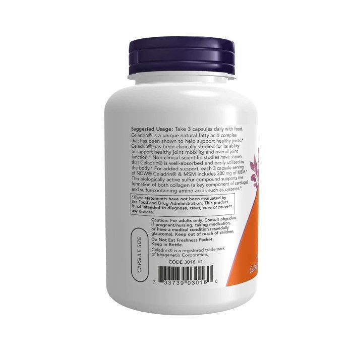 NOW Celadrin & MSM combines patented fatty acids with MSM to promote joint comfort, mobility, and cartilage health in convenient softgels.