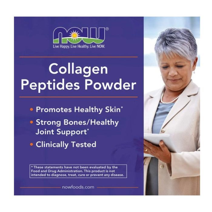 NOW Collagen Peptides Powder delivers 10 g of hydrolyzed bovine collagen per serving to support joint flexibility, bone strength, hair, skin, and nail health. Collagen is the most abundant protein in the body and is essential for maintaining connective tissue integrity as we age.