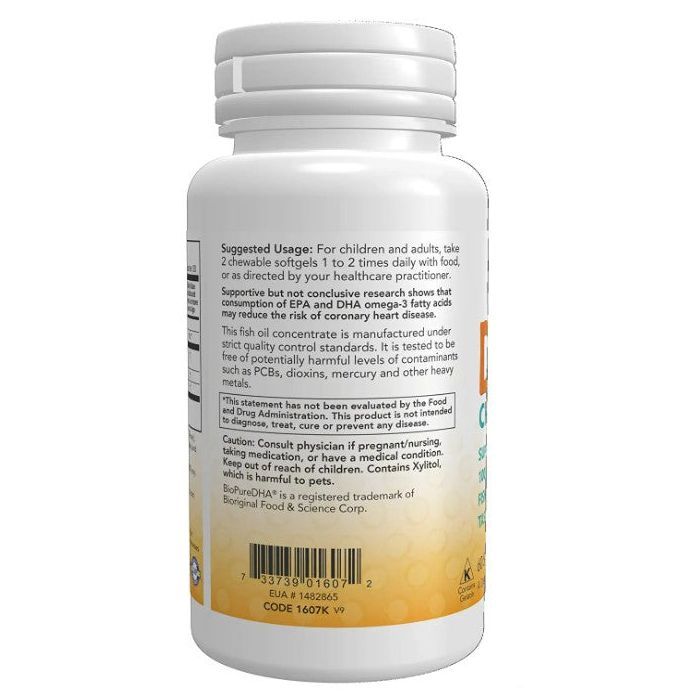 For children 3 years and older: Take 2 chewable softgels daily with food for optimal absorption. Chew thoroughly before swallowing. Avoid giving to children under 3 years due to choking risk. Consult a pediatrician before use if your child has a medical condition, is on medication, or has allergies to fish or soy. Store in a cool, dry place after opening.