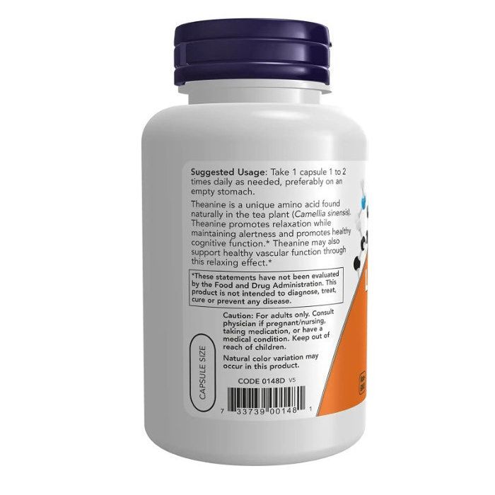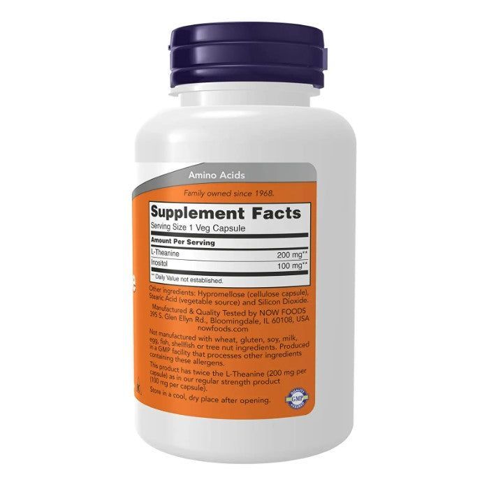 NOW L-Theanine 200mg with Inositol promotes calm, focus, and mood balance without drowsiness. Non-GMO, allergen-free, and vegan-friendly formula.