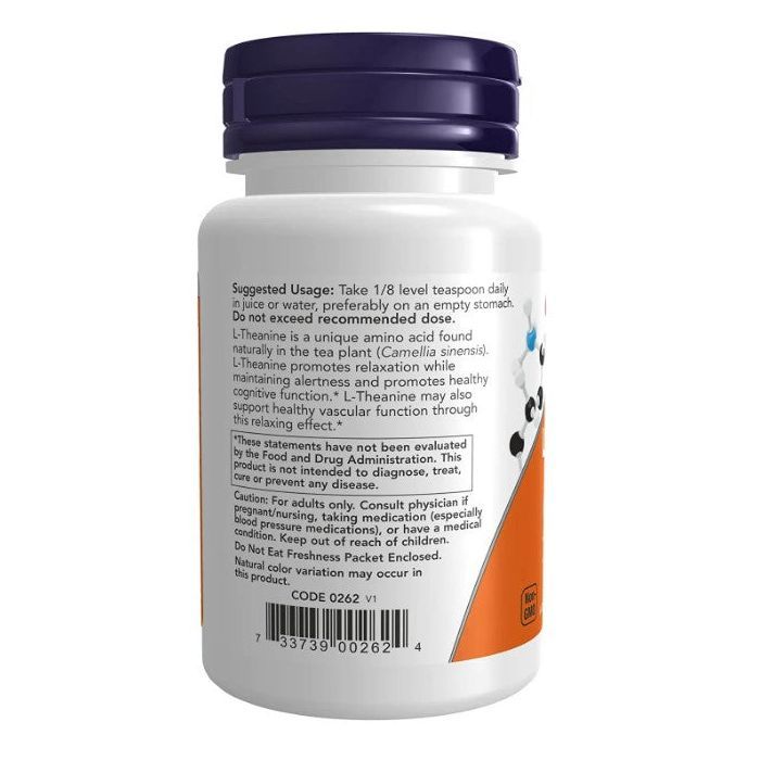 As a dietary supplement, take 1/8 teaspoon (approx. 0.3 g) of NOW L-Theanine Pure Powder daily, preferably on an empty stomach for optimal absorption. Can be mixed with water, juice, or a smoothie.