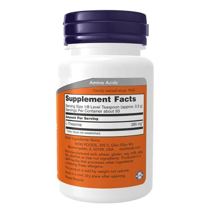 NOW L-Theanine Pure Powder delivers 285 mg per serving for calm focus and tension relief. Pure, vegan, allergen-free formula in a flexible powder form.
