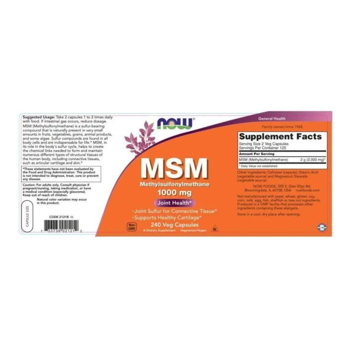 | NOW Foods | MSM (Methylsulfonylmethane) 1000mg | 2 Veg Capsules | Veggie Capsule | 240 Veg Capsules |