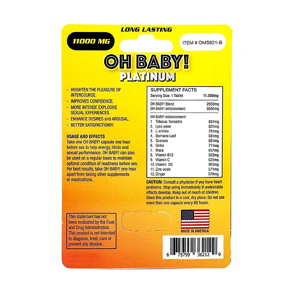 - Oh Baby! Platinum is a premium male enhancement pill that harnesses the power of natural herbs such as Tribulus, Guarana, and Ginseng to provide enhanced stamina, stronger erections, and increased size. This 11000mg formula is designed to deliver noticeable results quickly and effectively.