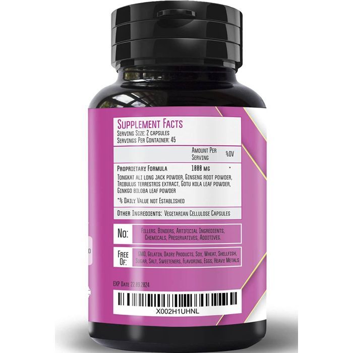 - Contains Tongkat Ali, Ginseng, Tribulus Terrestris, and Ginkgo Biloba