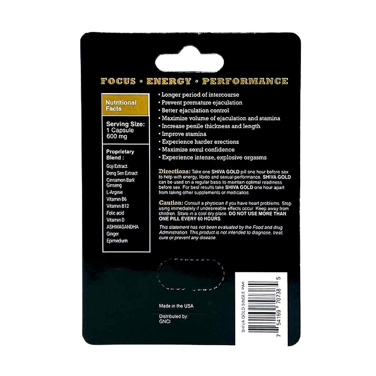 - Shiva Gold Capsule enhances male sexual performance with a potent mix of natural ingredients like Goji Extract, Ginseng, Ashwagandha, Cinnamon Bark, and essential vitamins B6, B12, D, Folic Acid, and more, designed for improved energy and stamina.