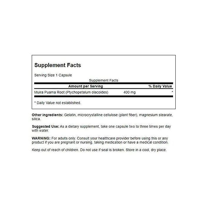 - Contains 400 mg of full-spectrum muira puama root per capsule