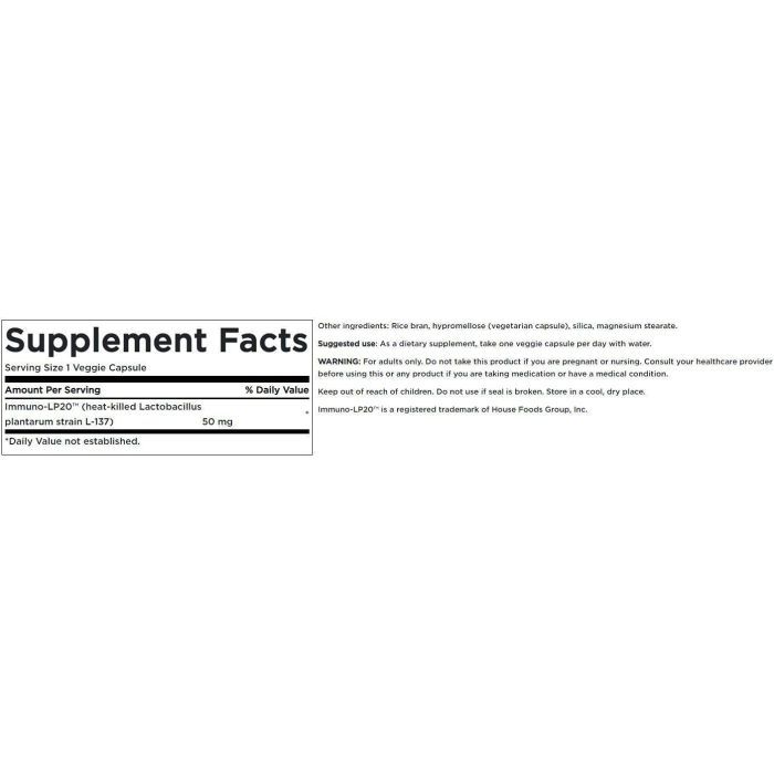 Swanson Immunobiotic Immuno LP20 supports immune health with patented heat-killed Lactobacillus plantarum L-137. Each veggie capsule delivers 50 mg Immuno-LP20. Suitable for vegetarians and daily use. Easy to take immune support supplement in a 30-count bottle.