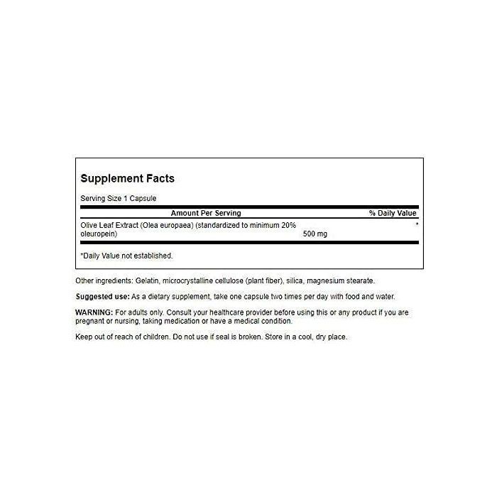 | Olive Leaf Extract (Olea europaea) (standardized to minimum 20% oleuropein) | 500 mg |