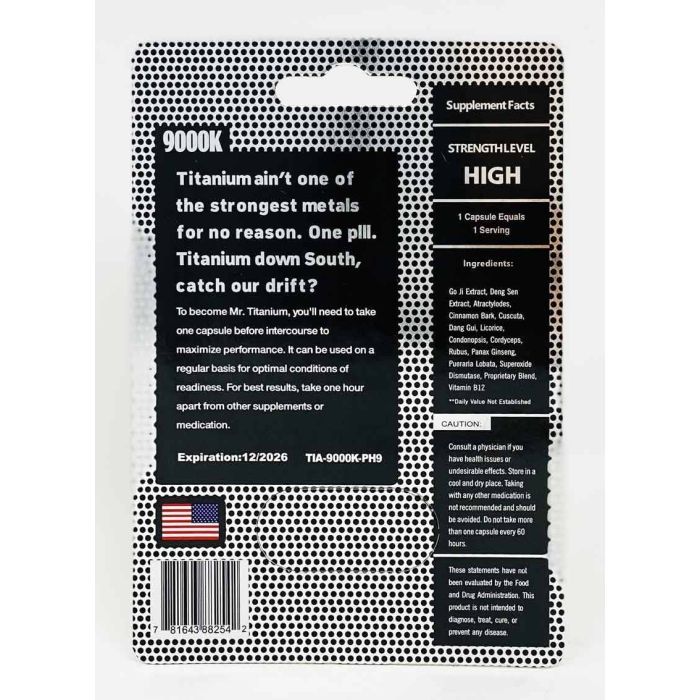 The formula includes hero ingredients like Go Ji Extract, Dong Sen Extract, Atractylodes, Cinnamon Bark, and more, which work synergistically to enhance blood flow, increase energy, and improve sexual confidence. Titanium 9000K is a premium supplement made in the USA and follows strict quality standards.
