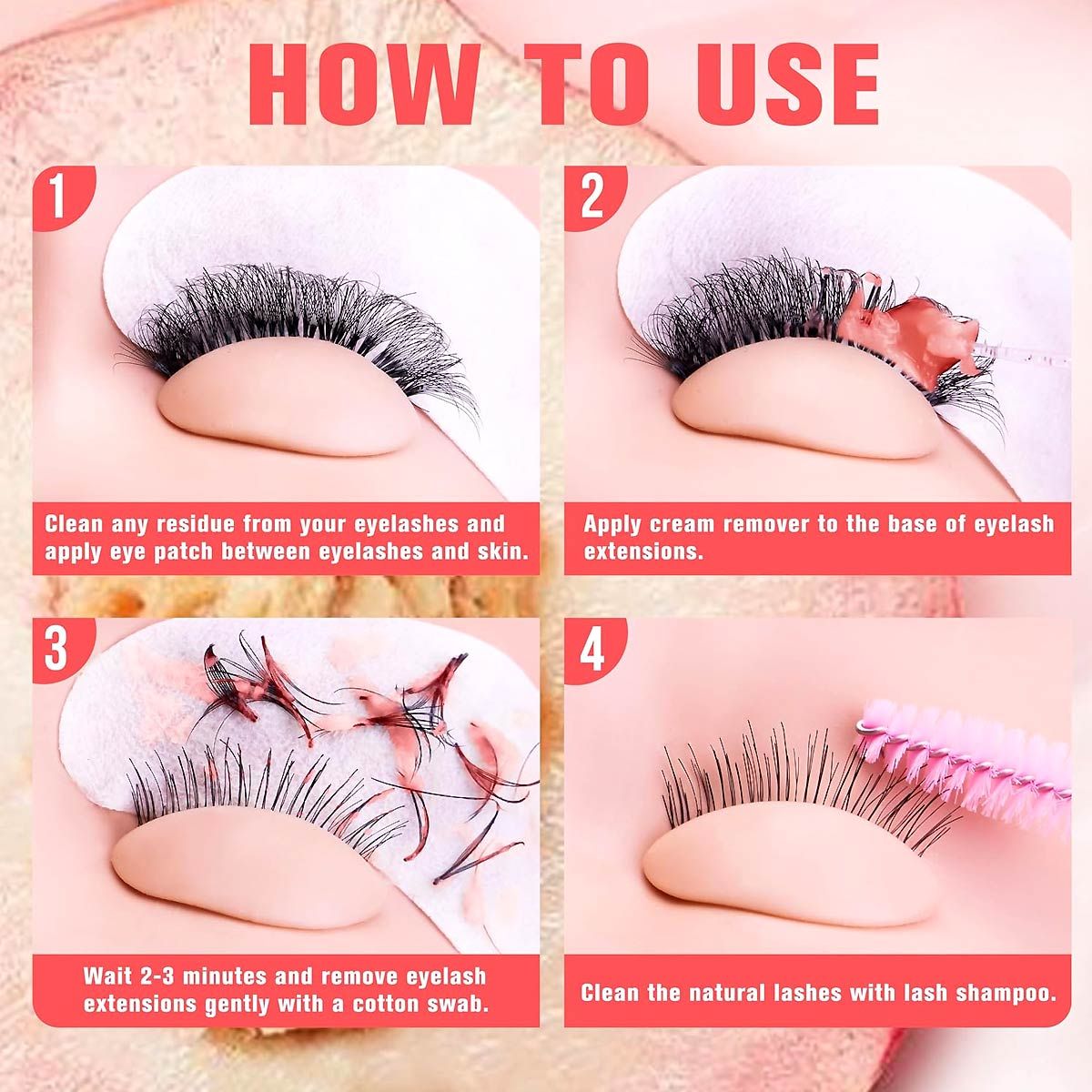 Apply the cream remover to the base of eyelash extensions. Wait for 2-3 minutes and gently wipe away with a cotton swab. Follow up with lash shampoo for natural lashes.asd