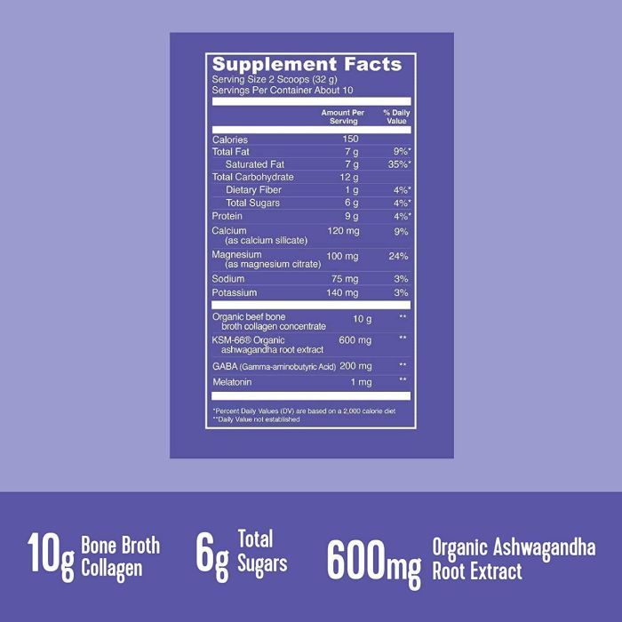 Each serving provides Organic Beef Bone Broth Collagen Concentrate, KSM-66® Ashwagandha, GABA, and Melatonin a powerful synergy designed to promote restful sleep, reduce stress, and encourage radiant beauty from within.