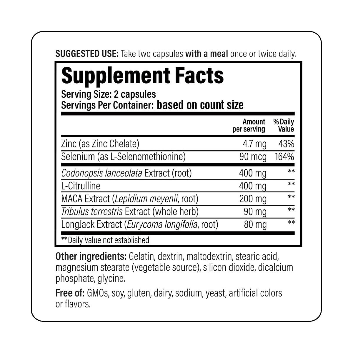 Hero Ingredients: Codonopsis root, Maca, Tribulus, LongJack, L-Citrulline, Zinc, and Selenium.