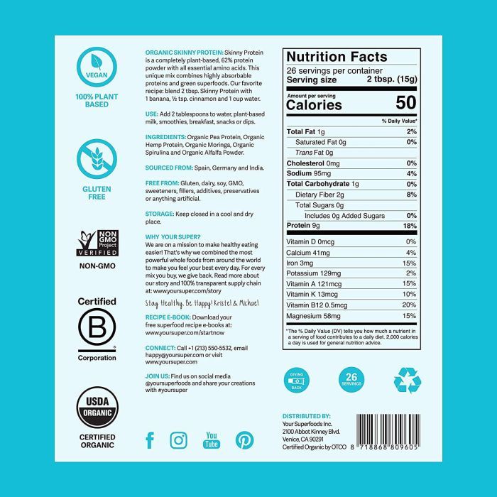 | Your Super | Skinny Protein Organic Superfood Mix | 2 Tbsp (15 g) | Powder | 14.1 oz (400 g) |