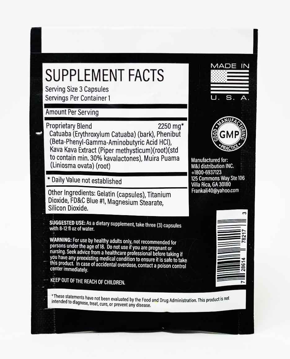 - Herbal blend with Catuaba, Kava Kava, and Muira Puama